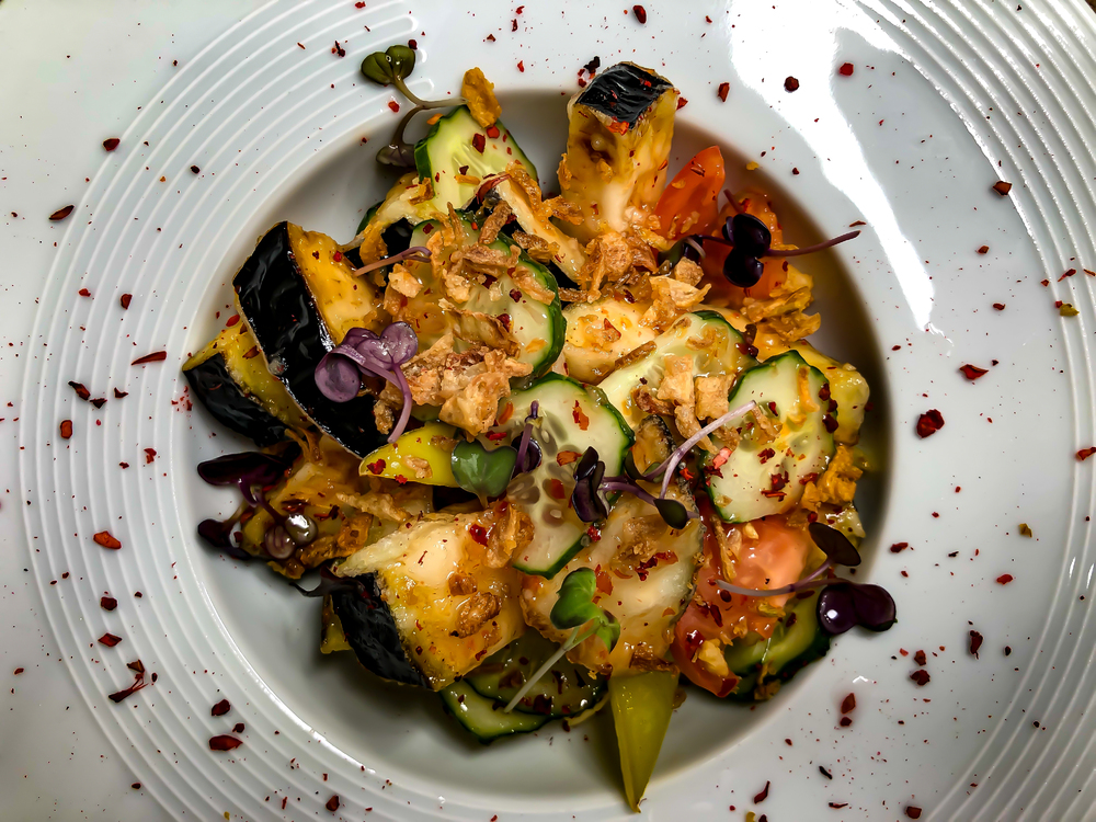 Баклажаны, томаты, перец болгарский, черри, соус чили