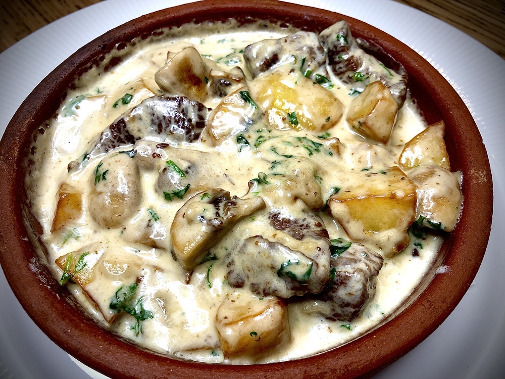 говяжья вырезка, картофель, вешенки, сливочный сыр, пармезан, кинза