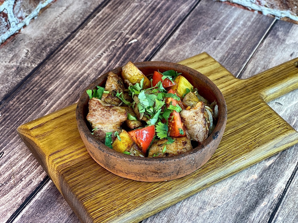 говяжья вырезка, картофель, томаты, лук, чеснок, кинза