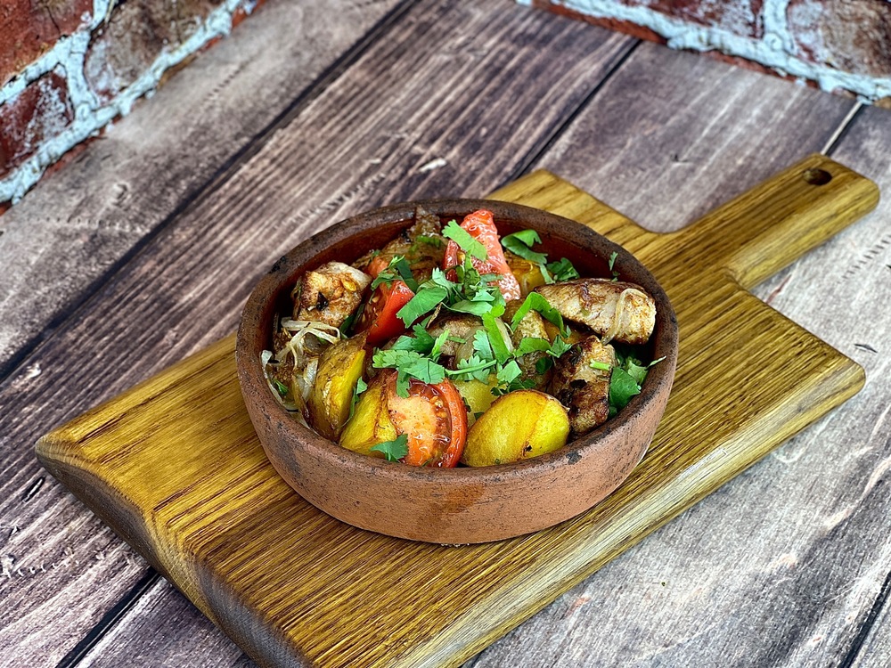 Свинина, картофель, томаты, лук, чеснок. Подается на кеци