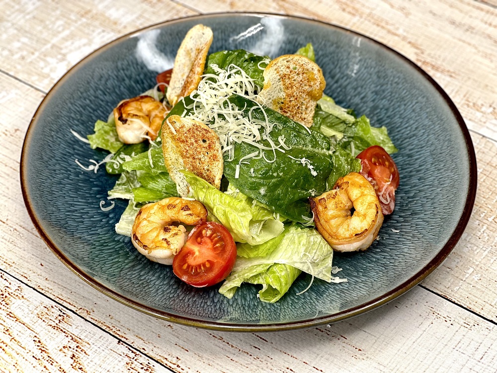 Салат романо, креветки, томаты, яйцо перепелиное, соус Цезарь, сухарики, сыр пармезан